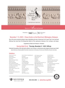 Maine Antique Digest, November 2025 99 Exhibitors Antique French Fine Arts Arader Galleries Aronson of Amsterdam Avery Galleries Barbara Israel Garden Antiques Betty Krulik Fine Art A Bird in Hand Antiques Brian Cullity American Antiques Christopher H. Jones American Antiques Dan and Karen Olson Antiques David Brooker Fine Art David A. Schorsch–Eileen M. Smiles Diana H. Bittel Dixon-Hall Fine Art D. M. DeLaurentis Fine Antique Prints Dolan/Maxwell Earle D. Vandekar of Knightsbridge, Inc. Elle Shushan Elliott & Grace Snyder Francis J. Purcell, Inc. Glen Leroux G. Sergeant Antiques The Hanebergs Antiques Hilary & Paulette Nolan HL Chalfant American Fine Art & Antiques Hollis Brodrick Ita J. Howe James L. Price Antiques James M. Kilvington, Inc. James Robinson, Inc. Janice Paull Jayne Thompson Antiques Jeff R. Bridgman Antiques Jeffrey Tillou Antiques Jonathan Trace Kelly Kinzle Levy Galleries Lillian Nassau, LLC Marcy Burns American Indian Arts, LLC Martyn Edgell Antiques, Ltd. Nathan Liverant and Son, LLC The Norwoods’ Spirit of America Olde Hope Oliver Garland The Parker Gallery Peter Pap Oriental Rugs Ralph M. Chait Galleries, Inc. Roger Winter Antiques R. M. Worth Antiques Schillay Fine Art, Inc. Schoonover Studios, Ltd. Schwarz Gallery Scott Bassoff, Sandy Jacobs Antiques Sheridan Loyd American Antiques Silver Art by D & R S. J. Shrubsole Antique Silver and Jewelry Somerville Manning Gallery Spencer Marks Thistlethwaite Americana Walker Decorative Arts William Cook Antiques William R. & Teresa F. Kurau List as of 8/25/25 November 7–9, 2025 | Chase Center on the Riverfront, Wilmington, Delaware One of the most acclaimed antiques shows highlighting the best of Americana for 62 years! Don’t miss the finest offerings from more than 60 distinguished dealers at this spectacular showcase of art, antiques, and design. Supported by Chubb and Freeman’s | Hindman Opening Night Party! Thursday, November 6 | 6:00–9:00 pm Celebrate the opening of the show with cocktails, hors d’oeuvres, and exclusive early shopping. Reserve your ticket! General Admission and Opening Night Party tickets include entry to all three days of the show and to Winterthur during the show dates. Best of Americana 800.448.3883 | winterthur.org/DAS Presented by